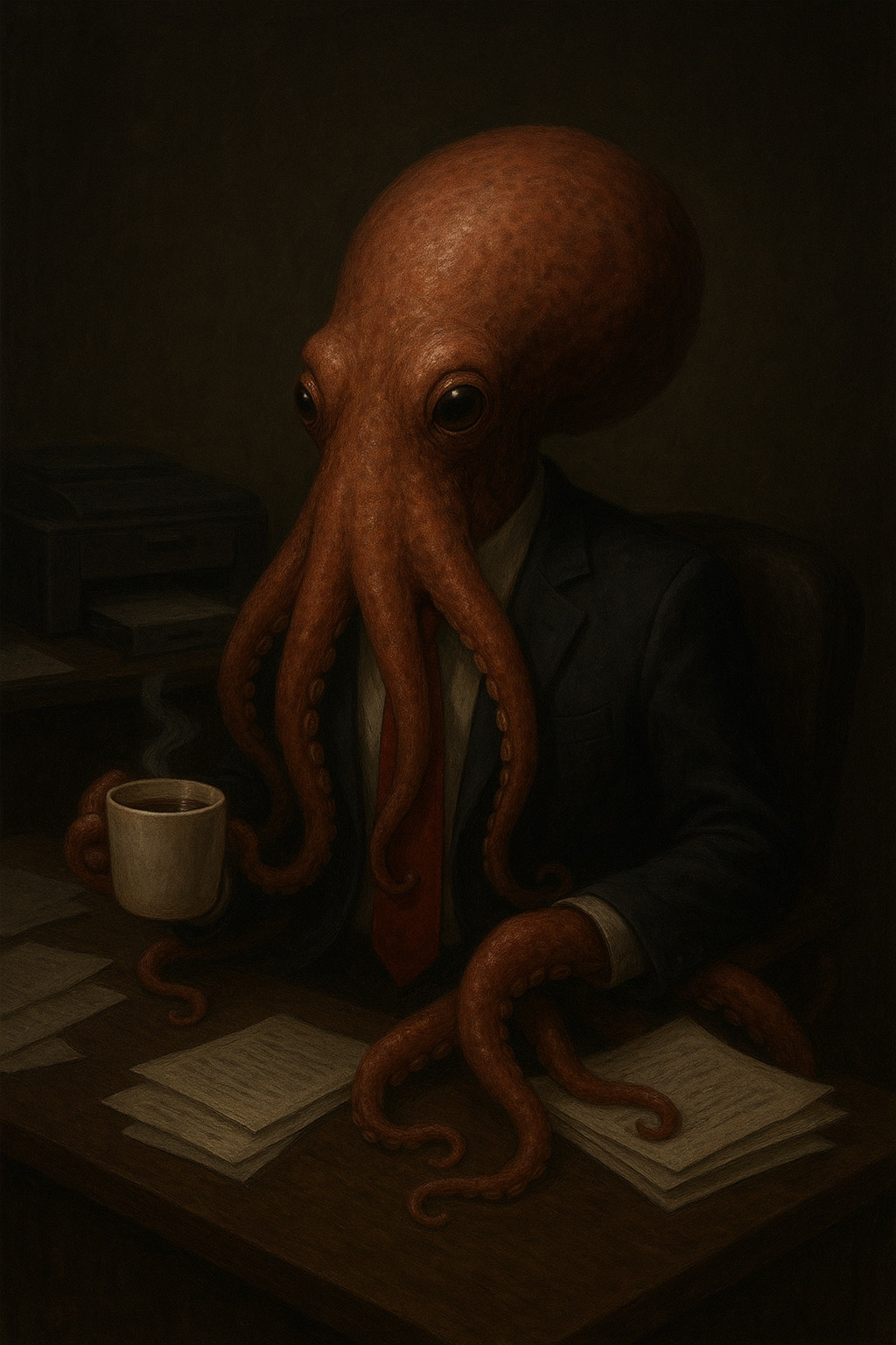 حملت القهوة لمكتب المدير واخرست اصوات القلوب. ودخلت بعد ان عدلت ربطة عنقي ، مستسلما خاضعًا لرأسماليه هذا العالم .